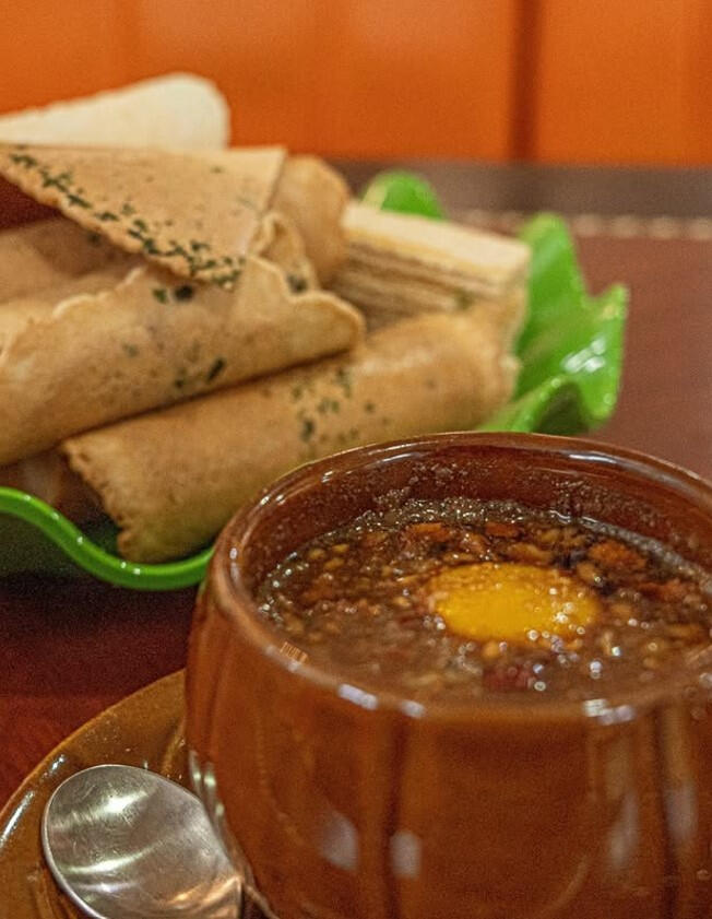 A nourishing tea brewed with real medicinal herbs and topped with a golden egg yolk.